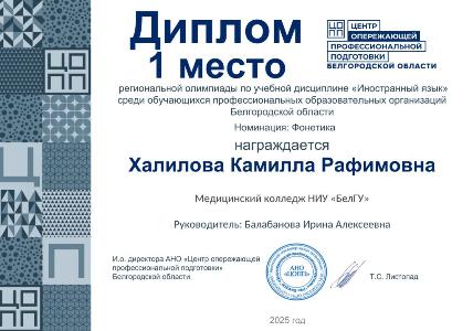 Студентка Медицинского колледжа НИУ «БелГУ», направления подготовки 31.02.01 Лечебное дело, группы 03052518 Маслакова Илария получила благодарственное письмо за участие в просветительских и благотворительных проектах автономной некоммерческой организации «Центр социальной медицинской помощи «АНГЕЛЫ МИЛОСЕРДИЯ» по итогам 2025 года.