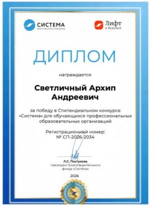 Студент группы 03052402 медицинского колледжа НИУ «БелГУ» Светличный Архип вошел в число победителей престижного стипендиального конкурса «Система», организованного платформой «Лифт в будущее», и стал одним из 50 лучших студентов профессиональных образовательных организаций со всей России.