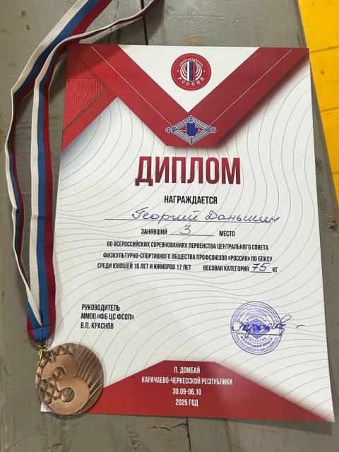 В Домбай Карачаево-Черкесской республики прошли Всероссийские соревнования первенства федерального совета физкультурно-спортивного общества профсоюзов «Россия» по боксу среди юношей 16 лет и юниоров 17 лет в весовой категории 75 кг, в котором студент Медицинского колледжа НИУ «БелГУ» специальности «Стоматология профилактическая» Даньшин Георгий занял почетное 3 место.