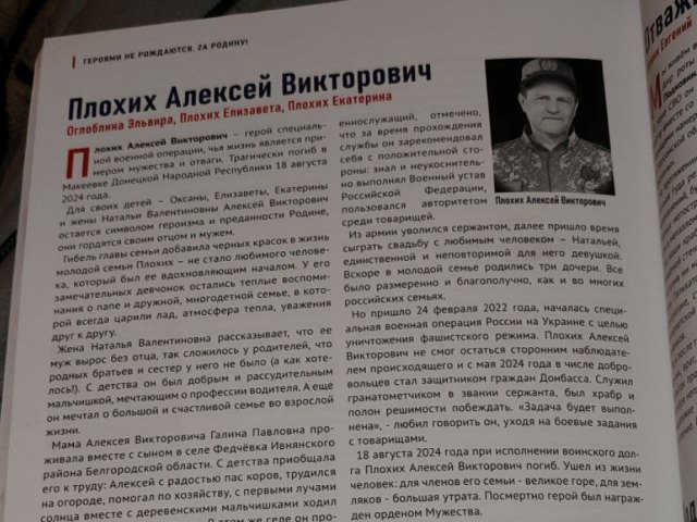 Плохих Екатерина решила посвятить свой рассказ памяти отца, Алексея Викторовича, погибшего при исполнении служебного долга и удостоенного ордена Мужества посмертно. Этот факт подчеркивает особую значимость ее творчества, которое отражает личные переживания и уважение к преданным защитникам Родины.