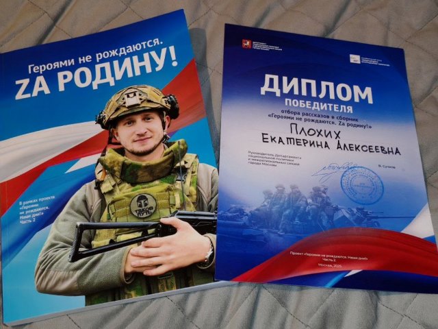 В Москве, в Музее Победы на Поклонной горе, 23 октября состоялось торжественное чествование авторов рассказов об участниках СВО, чьи работы были отобраны для включения в шестой сборник «Героями не рождаются. Za Родину!». Участники спецоперации — Герои Российской Федерации — вручили авторам-победителям конкурса дипломы, сборники и памятные подарки. Одной из победительниц этого конкурса стала студентка группы 03052535 Медицинского колледжа НИУ «БелГУ» Екатерина Плохих. Проект «Героями не рождаются. Za Родину!» вырос из проекта «Многонациональная победа», посвященного участникам и ветеранам Великой Отечественной войны, и стал его логическим продолжением.
