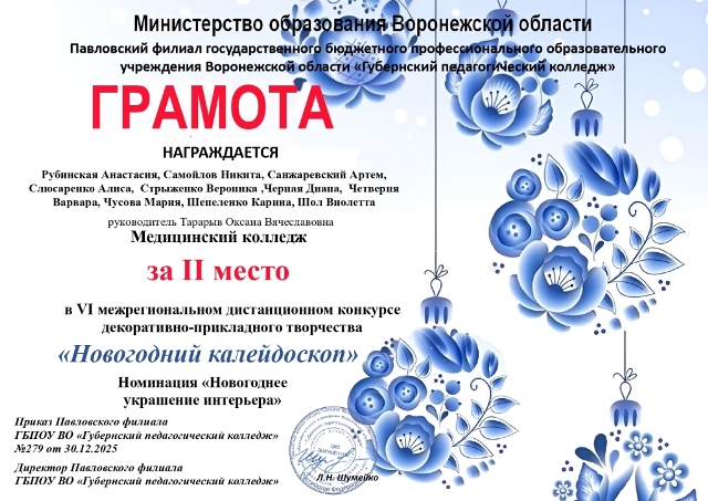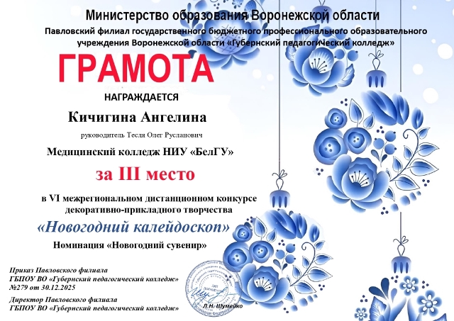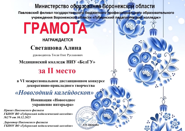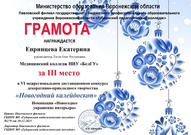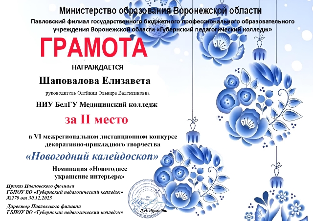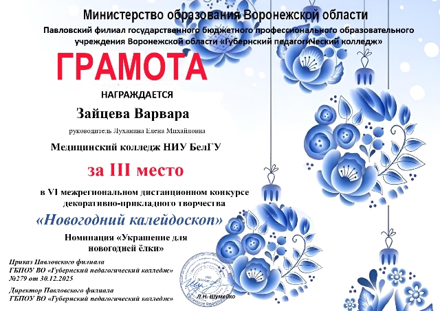 Студенты медицинского колледжа НИУ «БелГУ» достойно представили наше учебное заведение на VI межрегиональном дистанционном конкурсе декоративно‑прикладного творчества «Новогодний калейдоскоп»», который проводился в Павловском филиале ГБПОУ ВО «Губернский педагогический колледж».