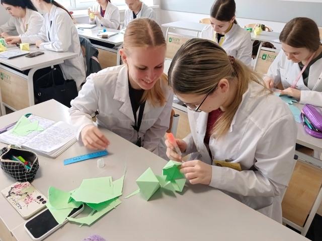 Самым запоминающимся моментом стало практическое задание: по предложению преподавателя ребята вырезали и склеили модели многогранников из раскладок. Своими руками они собрали тетраэдр, куб и другие фигуры — так абстрактная теория обрела осязаемую форму.