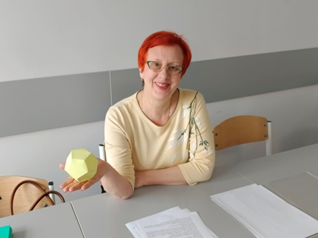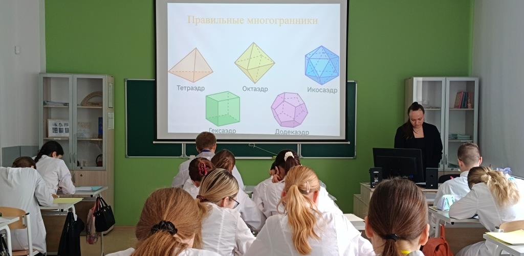 Далее ребята перешли к новой теме и узнали, что всего существует пять правильных многогранников. Преподаватель познакомила их с каждой фигурой: тетраэдром с четырьмя гранями в виде правильных треугольников, гексаэдром, более известным как куб, у которого шесть квадратных граней, октаэдром с восемью треугольными гранями, додекаэдром с двенадцатью правильными пятиугольниками в качестве граней и икосаэдром, состоящим из двадцати правильных треугольников.