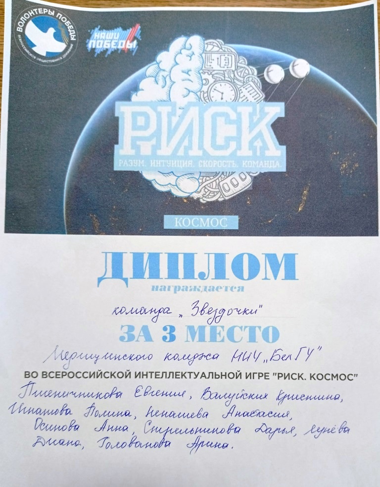 Студенты медицинского колледжа НИУ «БелГУ» приняли участие во Всероссийской интеллектуальной викторине «Риск. Космос» ко Дню космонавтики, состоявшейся в Центре гражданско-патриотического воспитания университета.