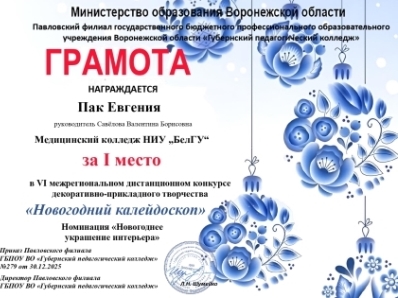 Студенты медицинского колледжа НИУ «БелГУ» достойно представили наше учебное заведение на VI межрегиональном дистанционном конкурсе декоративно‑прикладного творчества «Новогодний калейдоскоп»», который проводился в Павловском филиале ГБПОУ ВО «Губернский педагогический колледж».